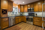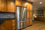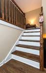 A dated raised ranch in need of some TLC, this home received new floors, trim and paint throughout the main level, a renovated and updated main entry area and a completely remodeled kitchen. The old wall separating kitchen and dining was removed to open the space while still providing separation from the living room. An old service door to a recently enlarged deck was removed as a slider added in the dining room made it obsolete. This allowed for additional counter space and provided a great spot for sink relocation with an exterior view via the added casement window. The sink was located where the oven is now originally. Can lights were installed in both the kitchen and dining areas with undercabinet accent lighting and a decorative light over the sink. Carpet and linoleum were removed and the entire main level refitted with waterproof and durable luxury vinyl tile. The main entry stairs were furnished with new oak railings replacing the original wrought iron railings and existing oak stair treads (a surprise lying beneath the existing carpet) were sanded and refinished with a custom stain to match the LVT flooring.